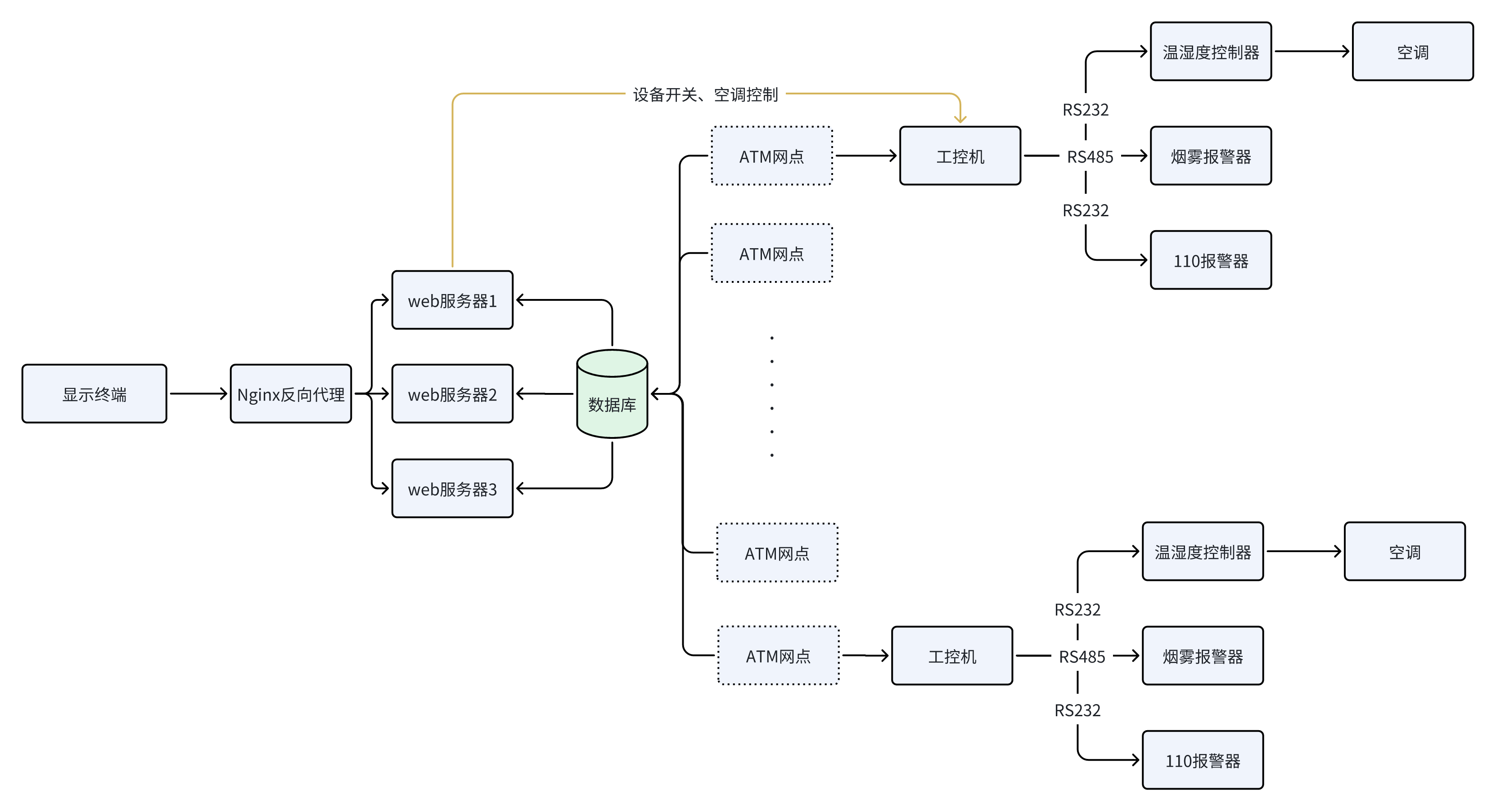 通过统一集中的环境监控平台来远程控制所有村镇的ATM无人网点的安全情况,远程控制设ATM网点的设备,温度与湿度。