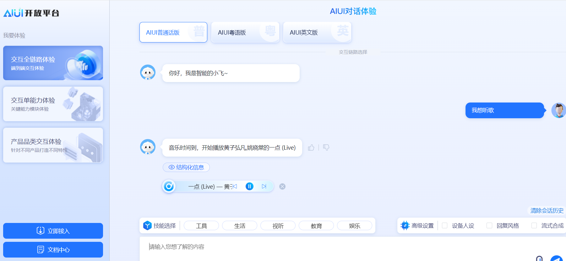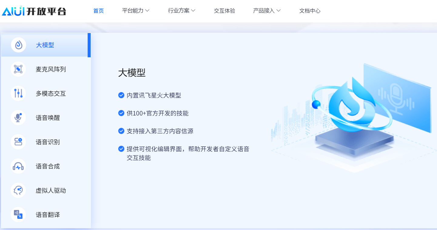 [2]。该平台基于讯飞星火大模型构建,具备语音唤醒、虚拟人驱动、离线交互等功能模块,可适配智能家居、教育硬件等十余个垂直领域的交互需求。截至2024年,AIUI已实现语音、视觉与虚拟人的"三合一"交互升级,形成覆盖1300种人设的标准化交互体系。